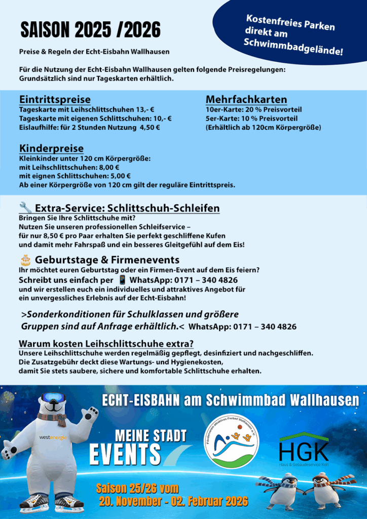 Regeln für einen reibungslosen Ablauf auf unserer mobilen ECHT-Eisbahn – Leihschuhe sind sorgfältig zu behandeln und nach dem Eislaufen vollständig zurückzugeben. Eislauffhilfen sind ebenfalls nach der Nutzung an den vorgesehenen Platz zurückzubringen. Auf der Eisbahn ist rücksichtsvoll zu fahren – riskante oder gefährdende Manöver sind nicht erlaubt. Handschuhe werden aus Sicherheitsgründen, besonders für Kinder, dringend empfohlen. Eintrittspreise und Leihgebühren werden auch bei nur kurzzeitiger Nutzung nicht zurückerstattet. Den Anweisungen unseres Aufsichtspersonals ist jederzeit Folge zu leisten. Das Betreten der Eisbahn ist für Besucher ausdrücklich nur mit Schlittschuhen erlaubt. Die Eisbahn kann während des Betriebs zur Aufbereitung für ca. 10–15 Minuten gesperrt werden. Wir bitten hierfür um Verständnis.